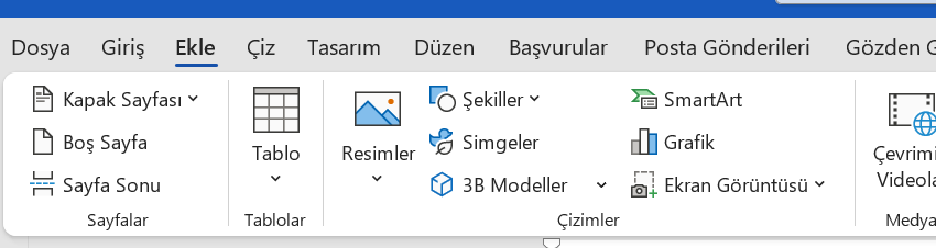 Word'ün üst menü şeridinde yer alan "Ekle" sekmesine tıkla. Bu menü, belgene metin dışındaki nesneleri (resim, tablo, simge vb.) eklemeni sağlar.
