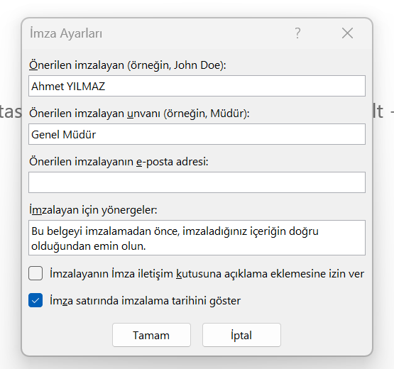 Çoklu İmza: Eğer birden fazla kişinin imzası gerekiyorsa (Örn: Yönetim Kurulu), aynı adımları tekrarlayarak yan yana veya alt alta birden fazla imza satırı ekleyebilirsin. Yan yana koymak için aralarında boşluk bırakman yeterlidir.