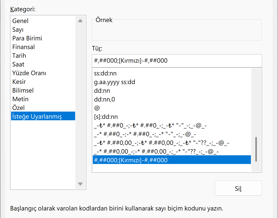 Kod Ne Anlama Geliyor? Excel'in Özel Biçimlendirme kodu 4 ana kısımdan oluşur: Pozitif; Negatif; Sıfır; Metin. Yukarıdaki kodda, negatif olanlar için [Kırmızı] ifadesi ve eksi işareti (-) ekleyerek sayının kırmızı renkte görünmesini sağladık.